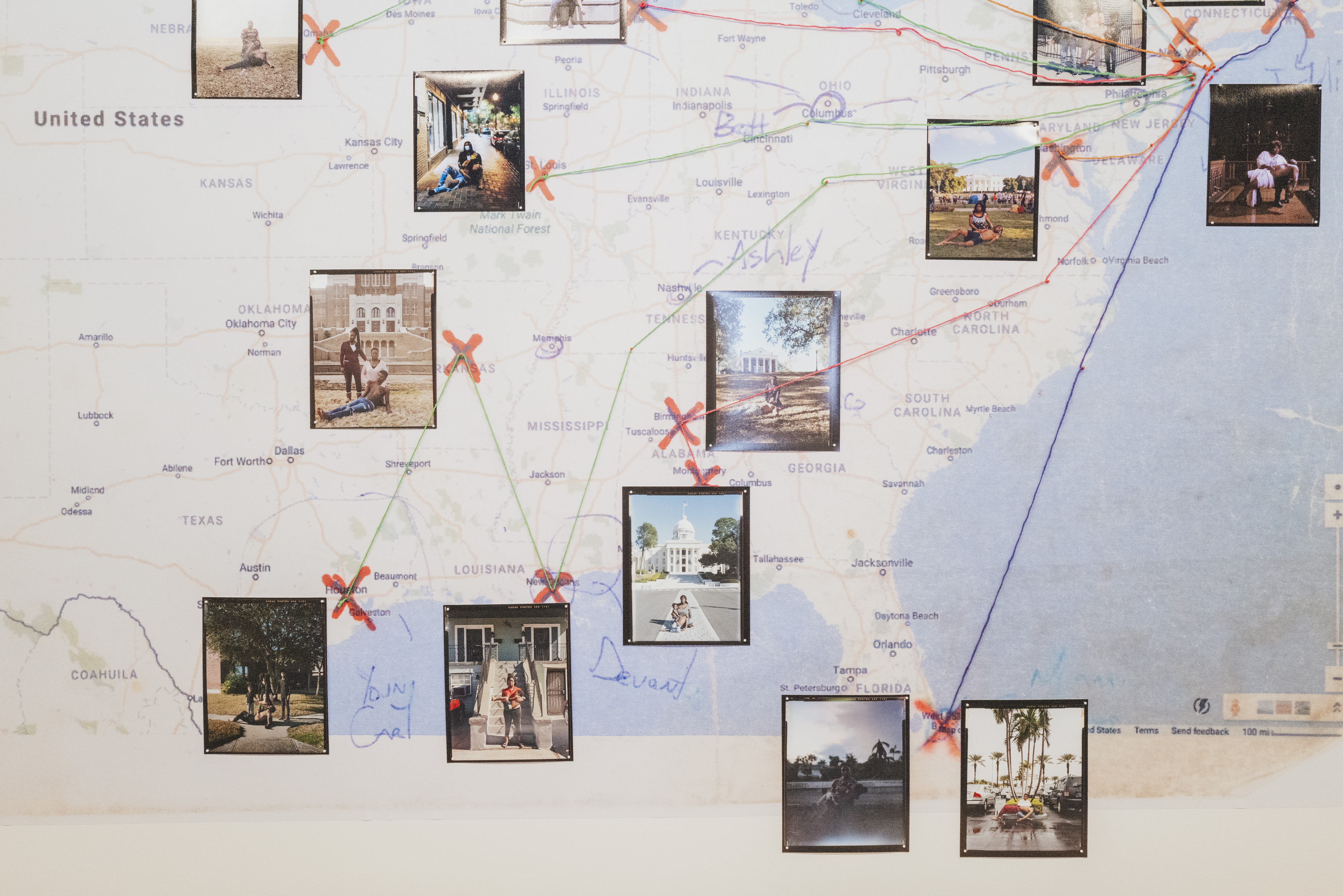 One wall has a lot of the texts that we collected for the project, the words of the mothers—some of which are in the Stranger Fruit monograph. There also some of the archive, just like where the project has gone, where it's been cited or referenced. A couple sections in the space showed that journey in different languages too. And then there's the map, the centerpiece, which traces out where I went from 2014 to 2022.