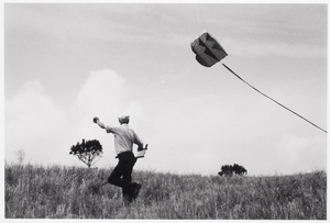 Flying a kite in a hayfield