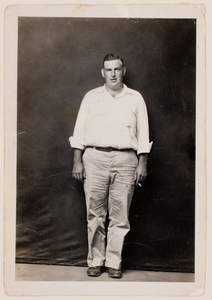 Disfarmer was not a particularly social individual, and little is known about his life. He was born Mike Meyer in Indiana and moved to Arkansas with his parents in the late 1800s. After his father died in 1914, he moved with his mother to Heber Springs, where he constructed a photography studio on the back porch of their house. Around 1930, when a tornado killed his mother and destroyed his house, he built a new studio on Main Street, and established himself as the town photographer. He tended to keep to himself, and was considered strange and eccentric by many townspeople. He changed his name to Disfarmer after his mother's death because he believed that a tornado had taken him from his real place of birth and deposited him with the Meyer family. Disfarmer used 5 x 7 inch glass plates early in his career and 3 ¼ x 5 ½ inch plates later, and he always made contact prints.