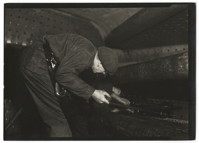 [Boilermaker tapping for stay-bolts in boiler of modern locomotive, Baldwin Locomotive Works, Eddystone, Pennsylvania]
