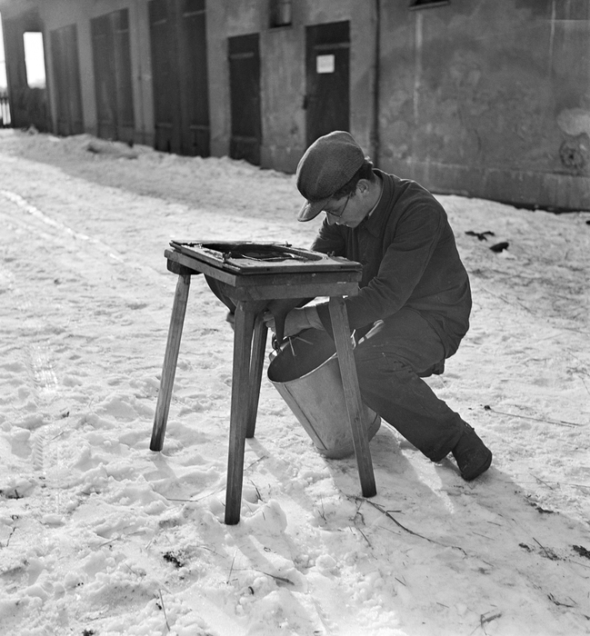 [Boy learning to milk cows by using a model of a cow's udders, Niederschönhausen, an occupational training camp for German Jews hoping to emigrate, Pankow, Berlin]