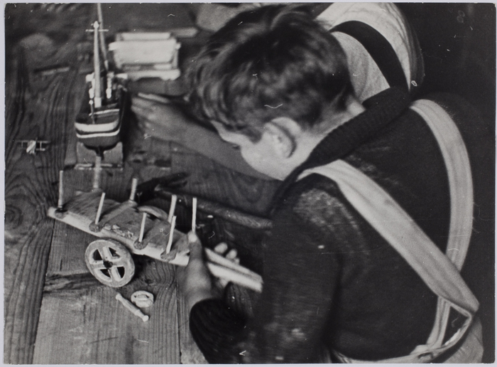[Boy refugee building wooden toy, near Biarritz, France]