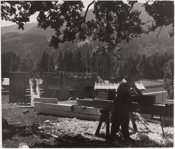 Chim (David Seymour) [Building of a private villa in the woods near lake Tegensee, Upper Bavaria, Germany] Date 1949 Dimensions Image (Paper): 8 1/16 x 9 7/16 in. (20.5 x 24 cm) Print medium Photo-Gelatin silver Credit Line Gift of Ben Shneiderman Accession No. 2022.7.86