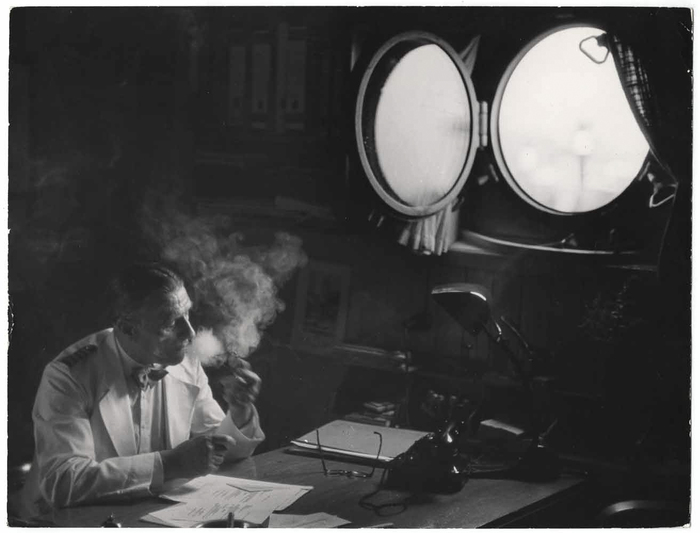 [Captain Peter Firmenich, who worked with the German Navy, smoking at his desk in a room with port hole windows, Hamburg, Germany]
