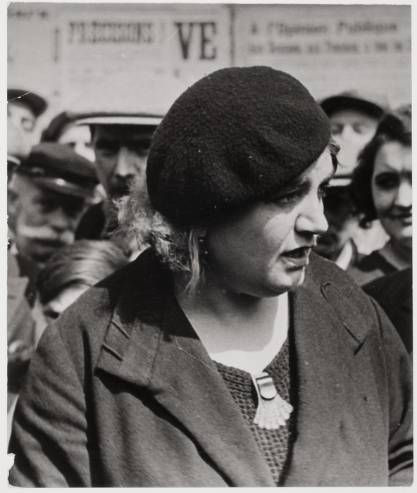 [Close-up on a black-hatted woman in the street during the Front Populaire demonstrations, Paris]