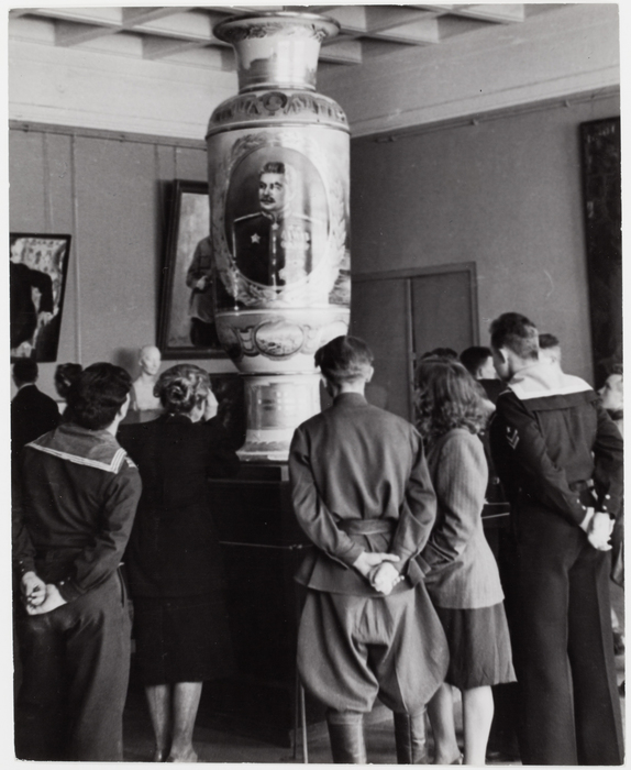 [Crowd viewing painted vase with portrait of Joseph Stalin at The Tretyakov Gallery, Moscow]