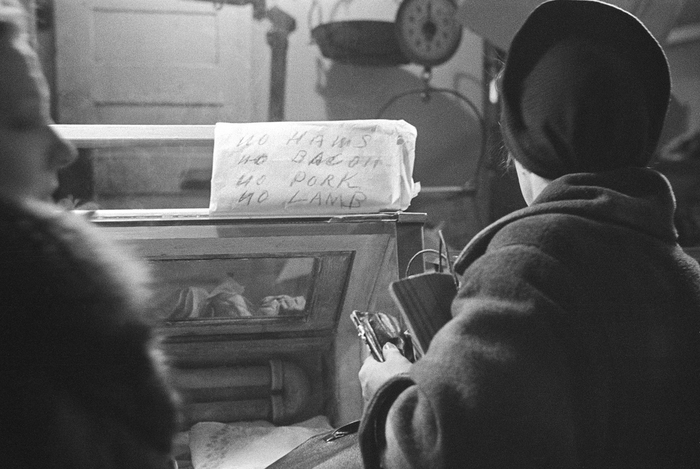 [Customers waiting for service at a butcher's counter during wartime rationing. The sign reads "No hams, No bacon, No pork, No lamb," Washington Market, New York]