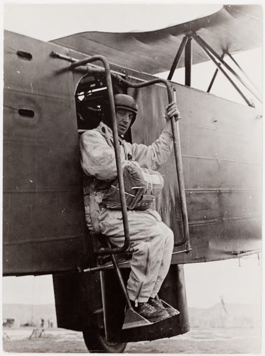 [French air force parachute, Parachutist sitting on the stairs of a plane, at Paratrooper school in Avignon-Pujaut, France]