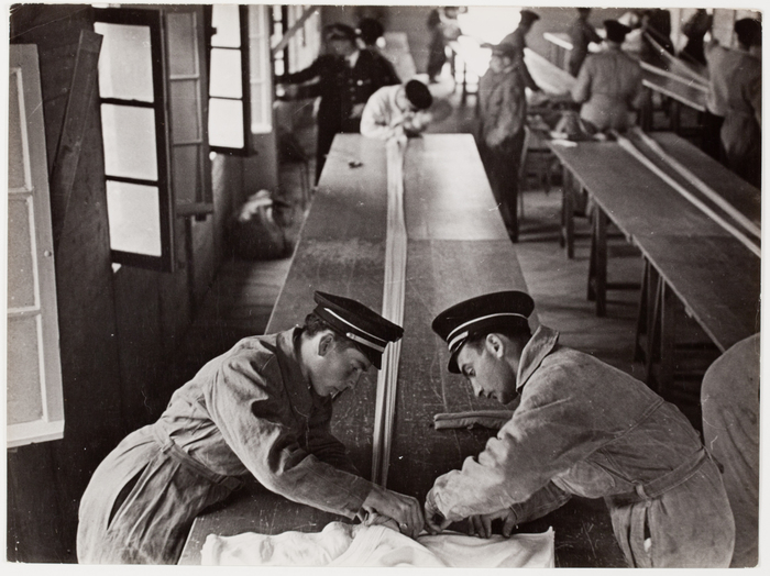 [French air force parachute, Students practice folding a parachute at Paratrooper school in Avignon-Pujaut, France]