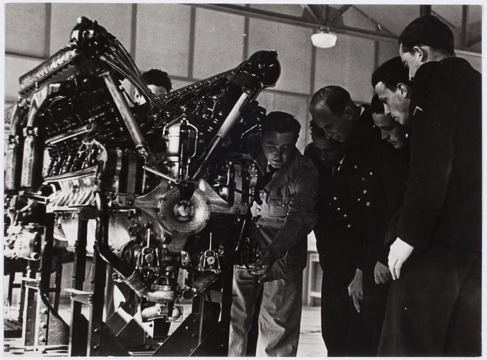 [French air school, Instructor shows students the parts of a plane engine in Istres, France]