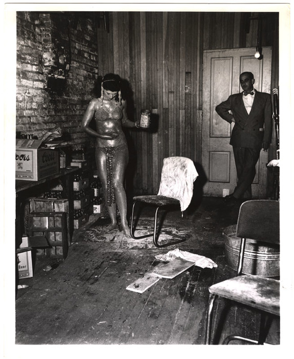 [Gold-painted stripper applying sparkles]
