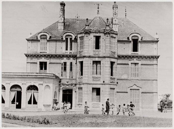 [Group of children and a tutor in front of a house for Spanish refugee children organized by the Foster Parents' Plan, near Biarritz, France]