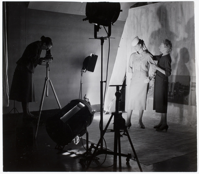 [Harper's Bazaar editor Carmel Snow working on fashion shoot with photographer Louise Dahl-Wolfe and model Suzy Parker]