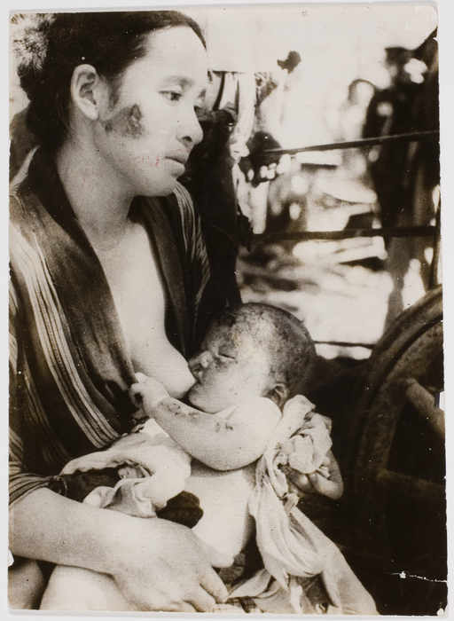 Yosuke Yamahata [Injured mother suckling baby as they both await doctor following atomic bomb blast, Nagasaki] Date 1945 Location Japan Nagasaki Dimensions Image: 5 15/16 x 4 1/4 in. (15.1 x 10.8 cm) Print medium Photo-Gelatin silver Credit Line The LIFE Magazine Collection, 2005 Accession No. 1391.2005