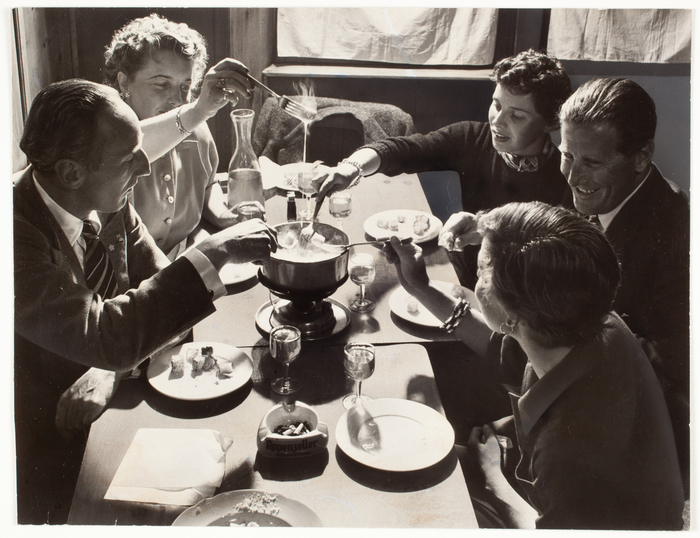 Robert Capa [Judith Stanton and companions eating fondue, Zermatt, Switzerland] Date 1950 Location Switzerland Zermatt Dimensions Image (paper): 7 11/16 x 10 in. (19.5 x 25.4 cm) Print medium Photo-Gelatin silver Credit Line The Robert Capa and Cornell Capa Archive, Gift of Cornell and Edith Capa, 2010 Accession No. 2010.93.387