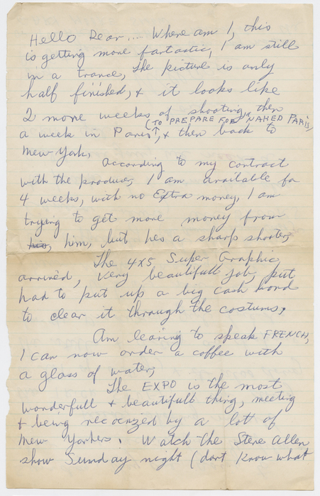 Weegee [Letter from Weegee in Brussels to Wilma Wilcox in New York City] Date ca. 1958 Location Belgium United States Kings New York Brussels Dimensions Paper (Letter Page 1 of 1): 13 1/4 x 8 3/8 in. (33.7 x 21.3 cm) Print medium Ephemera Credit Line Bequest of Wilma Wilcox, 2009 Accession No. 2009.70.68