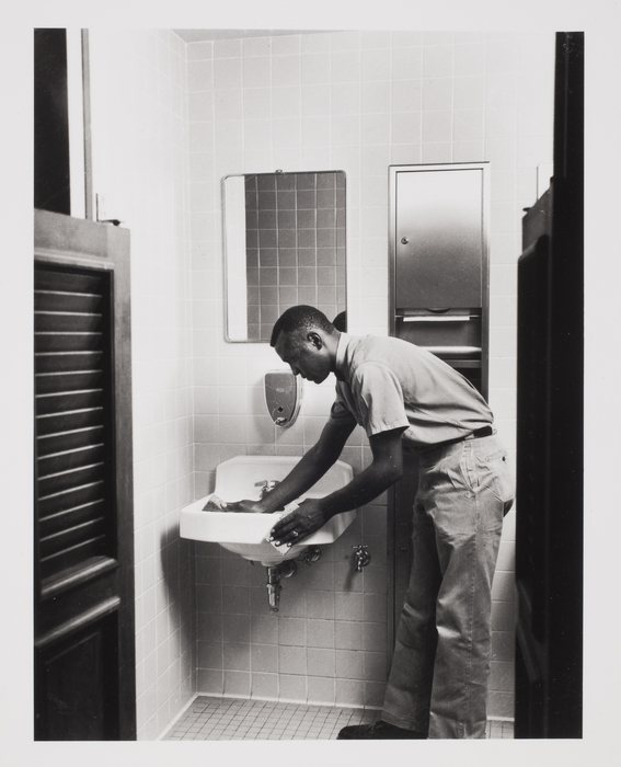 [Man cleaning bathroom sink]