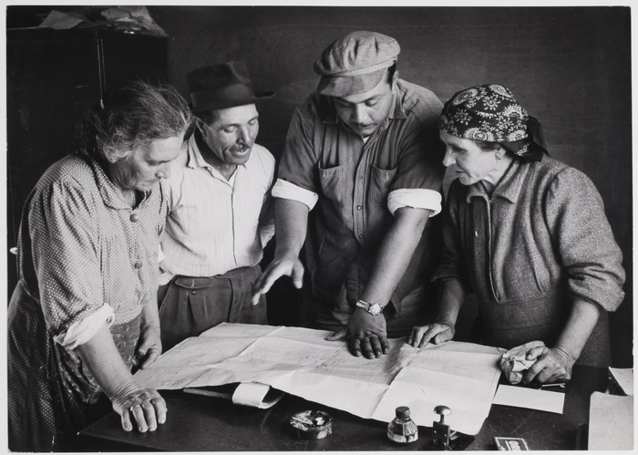 [Man shows a town planning map to another man and two women, Alma, Israel]