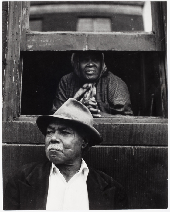 [Man standing in front of woman leaning on windowsill, Harlem, New York]