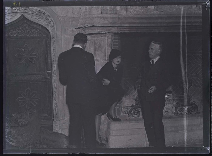 [Man, woman, and Charlie Chaplin next to hearth, Hearst Ranch, San Simeon, California]