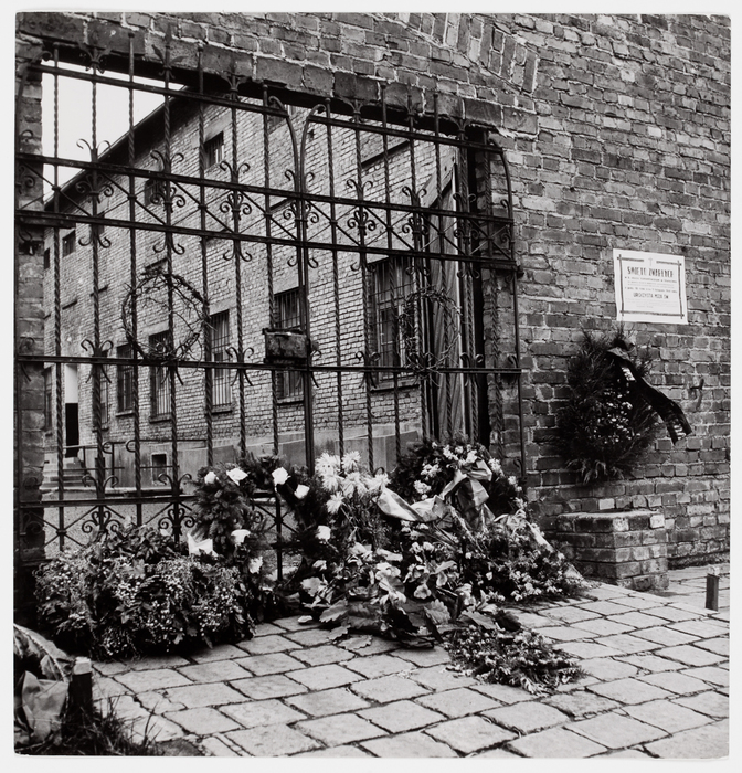 [Memorial wreaths of fresh flowers in front of an iron gate, Auschwitz, Poland]