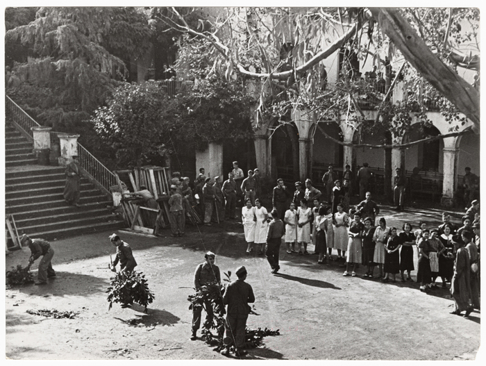 [Men and women preparing for farewell ceremony for the International Brigades, Les Masies, Spain]