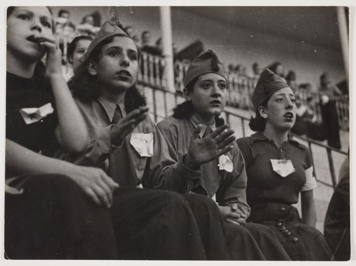 Robert Capa [Militiawomen watching a bull fight, Barcelona, Spain] Date September 1936 Location Spain Dimensions Image (Paper): 7 1/16 x 9 5/8 in. (18 x 24.4 cm) Print medium Photo-Gelatin silver Credit Line The Robert Capa and Cornell Capa Archive, Gift of Cornell and Edith Capa, 1992 Accession No. 728.1992