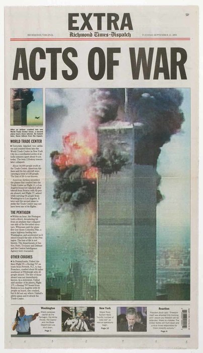 Richmond Times-Dispatch Newspaper: Acts of War Date September 11, 2001 Location United States New York Virginia Richmond Print medium Print-Lithograph Credit Line Purchase, with funds provided by the ICP Acquisitions Committee, 2006 Accession No. 2006.30.547