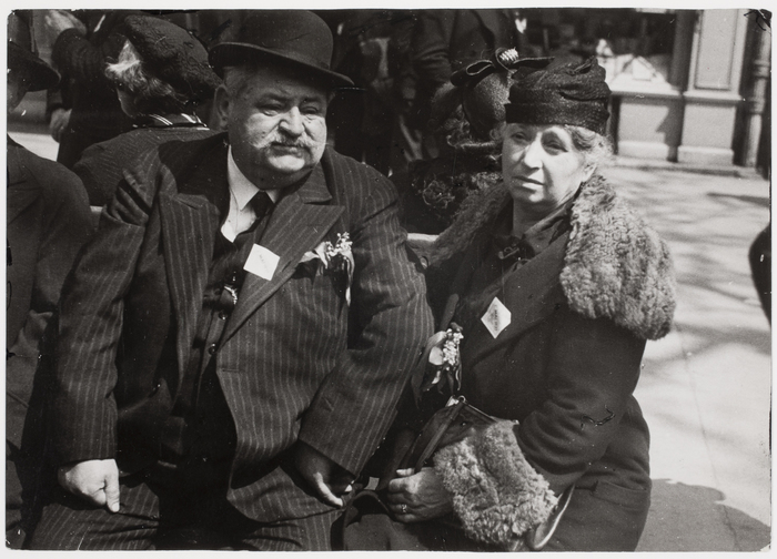 [Old couple sitting on a bench wearing a "May 1937" sticker on their clothes]