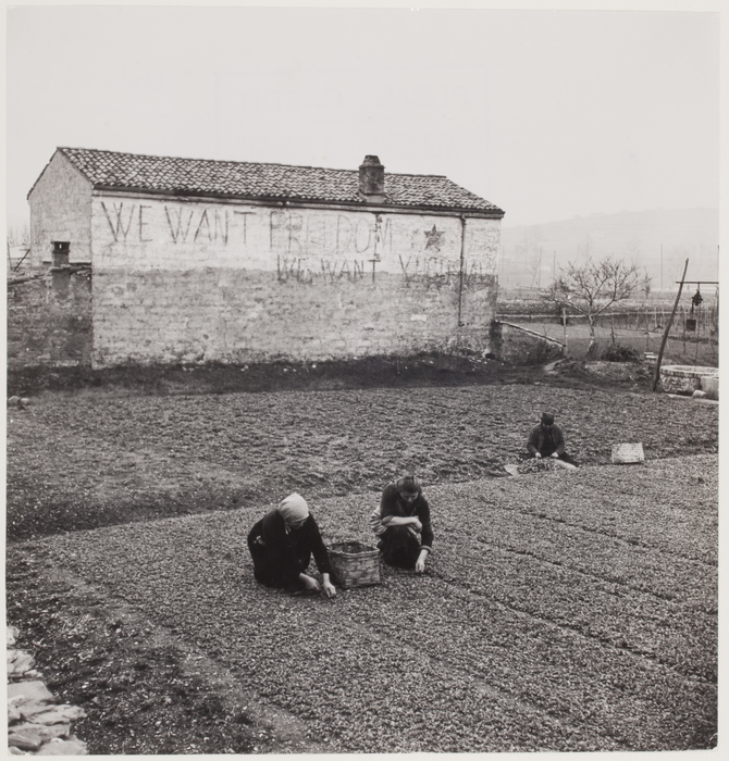 [Peasants working a field with "We want freedom, we want Yugoslavia" written on the wall of the house in the background, Trieste, Italy]