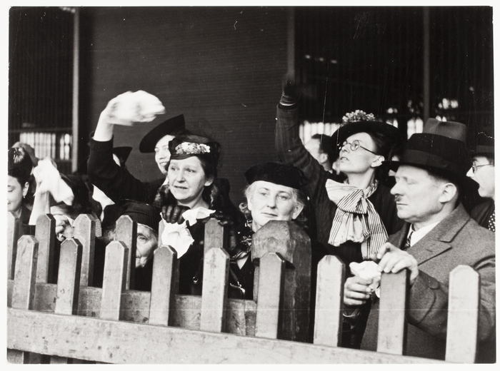 [People waving goodbye behind a wooden barricade, Antwerp harbor]
