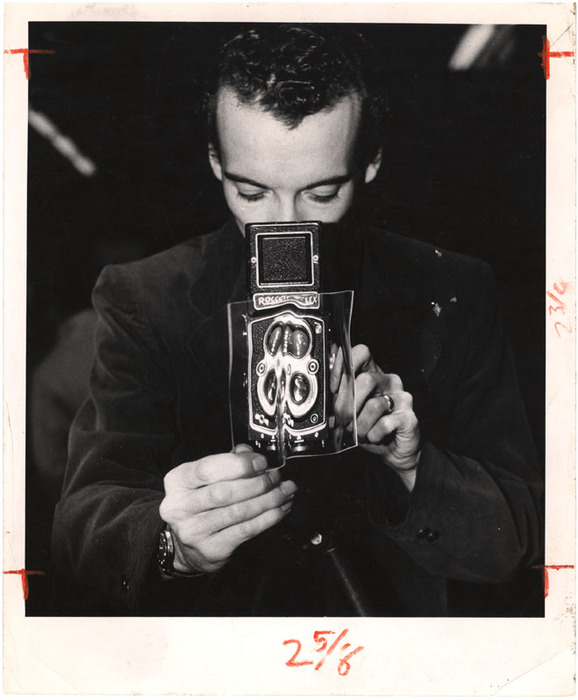 [Photographer Holding a Bent Piece of Plastic in Front of Rollieflex Camera]