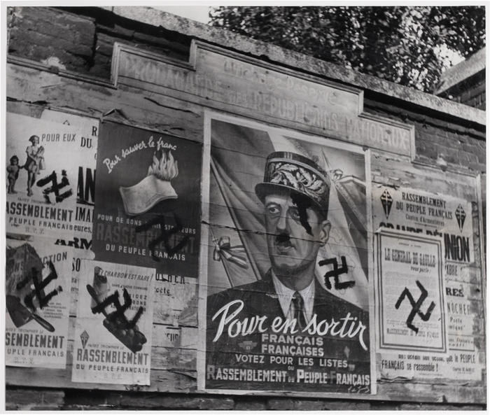 Chim (David Seymour) [Political poster with images of Charles de Gaulle covered with Nazi emblems, Armentières, France] Date 1947 Location France Armentières Dimensions Image (Paper): 8 1/8 x 9 5/8 in. (20.6 x 24.4 cm) Print medium Photo-Gelatin silver Credit Line Gift of George Stephanopoulos, 2005 Accession No. 2272.2005