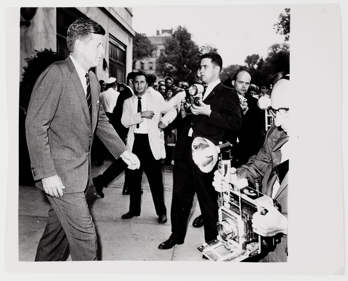 [President John F. Kennedy surrounded by reporters outside the Ritz Carlton Hotel, Boston]