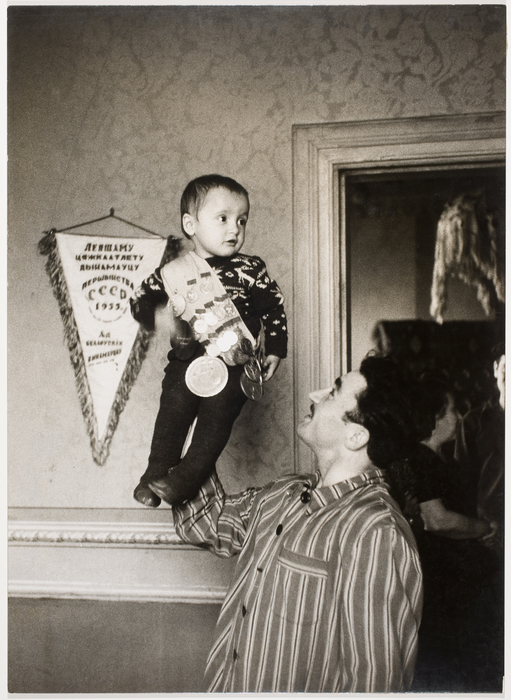 [Rafael Tchimichkian hoisting his daughter Jeannette, who wears his championship featherweight medals]
