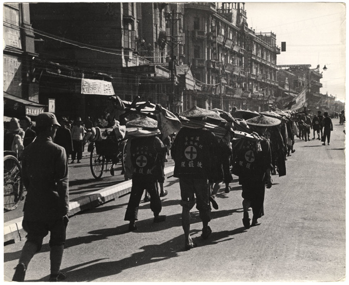 [Red Cross workers looking for the wounded after the air battle between Japanese and Chinese fighter planes, Hankou, China]