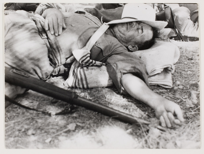 [Republican soldier sleeping on the ground with his hat over his face after a three day battle, Cordoba front, Spain]