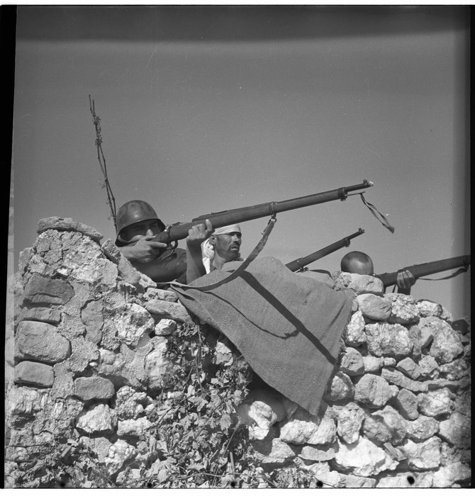 [Republican soldiers aiming rifles over a barricade, Aragón front, Spain]