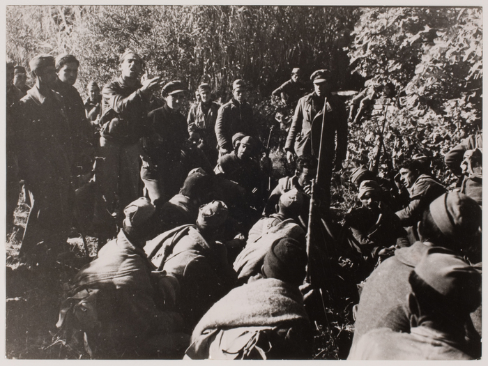 [Republican soldiers listening to their commander give a speech, Rio Segre, Aragón Front, near Fraga, Spain]