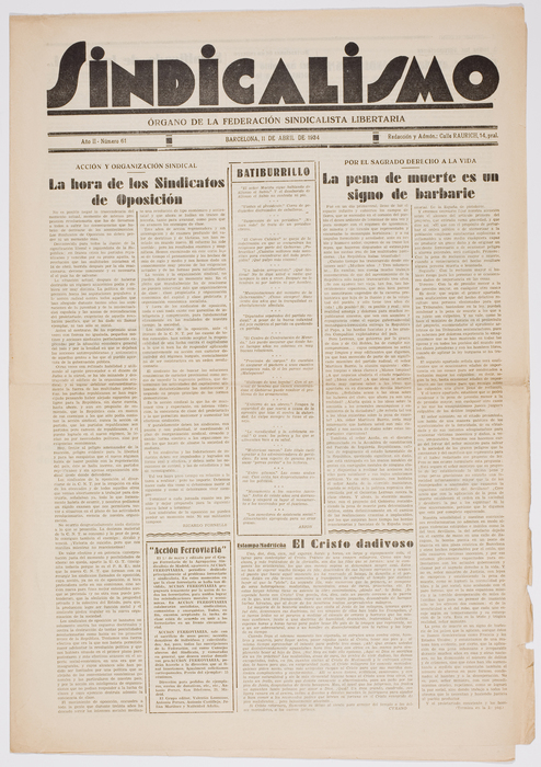 Sindicalismo Sindicalismo Date April 11, 1934 Location Spain Cataluña Barcelona Dimensions Overall: 21 1/2 x 15 1/2 in. (54.6 x 39.4 cm) Print medium Print-Lithograph Credit Line Museum Purchase, 2007 Accession No. 2007.57.127