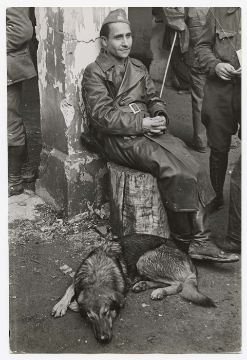[Sitting volunteer and dog, farewell ceremony for the International Brigades, Les Masies, Spain]