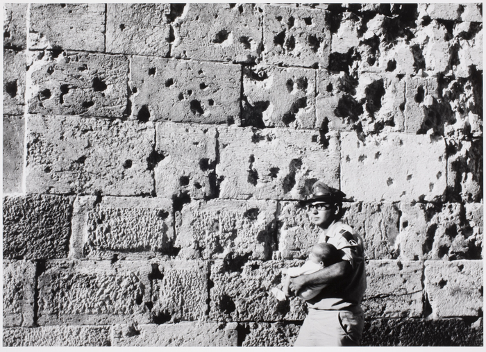Soldier with baby passing in front of wall which bears the scars of bullets from the 1972 war