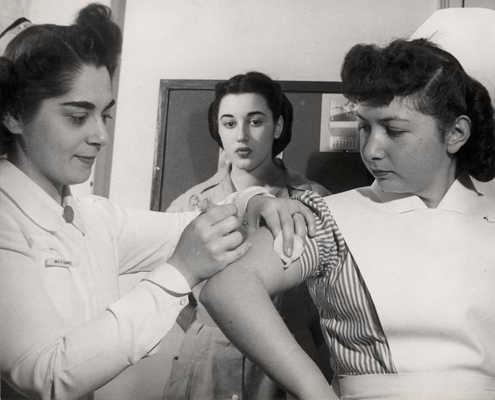 [Student nurses practicing their skills by giving each other injections, Jewish Hospital School of Nursing, Crown Heights, Brooklyn, New York]