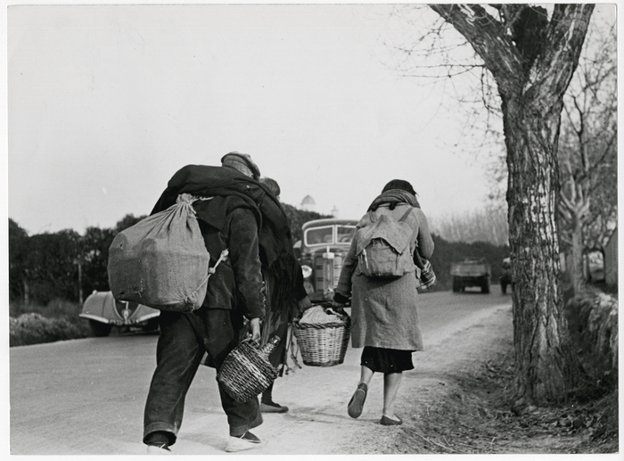 [Three people carrying their belongings, along the road between Tarragona and Barcelona]