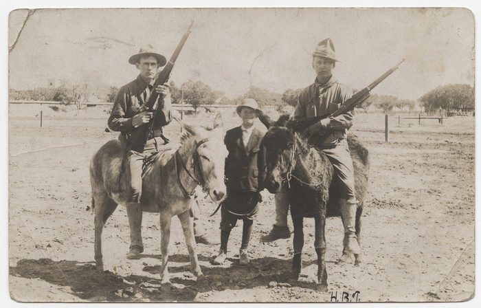 Unidentified Photographer [Two soldiers on donkeys with child] Date 1911 Location United States Texas El Paso Dimensions Image (paper): 3 3/8 x 5 3/8 in. (8.6 x 13.7 cm) Print medium Photo-Gelatin silver Credit Line Museum Purchase, 2011 Accession No. 2011.14.15