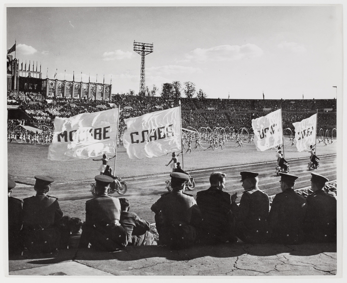 [Uniformed Russian soldiers watching a gymnastic demonstration at Dynamo Stadium during Moscow's anniversary celebrations, Moscow]