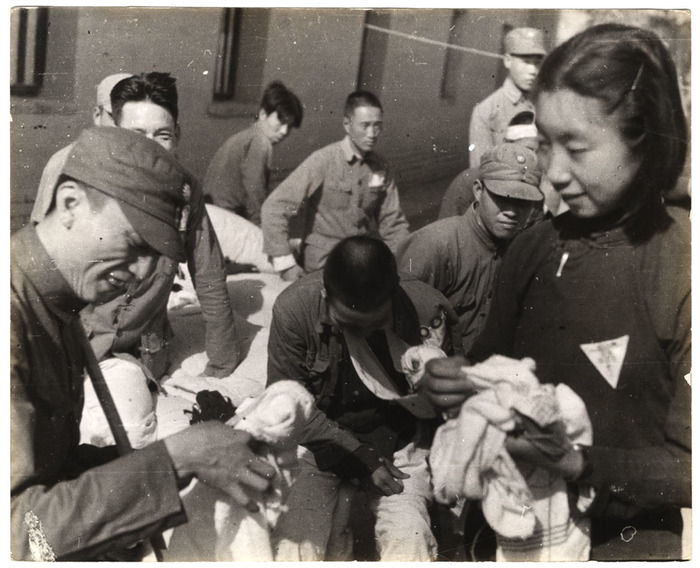 [Volunteers distributing clothes at the parade commemorating the thirteenth anniversary of Sun Yat-sen's death and the first anniversary of the Sino-Japanese War, Hankou, China]