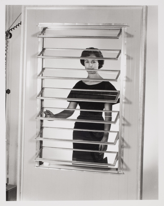[Woman demonstrating jalousie window unit]