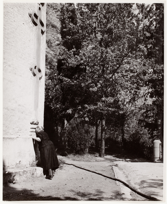 [Woman kissing a sculpted cross on an external church wall, Soviet Republic of Georgia]