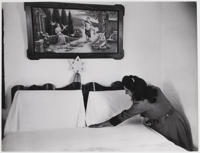 Chim (David Seymour) [Woman makes a bed. The bedroom has the Star of David and a painting above the bed, Alma, Israel] Date 1951 Location Israel Alma Dimensions Image (Paper): 9 5/16 x 12 1/8 in. (23.7 x 30.8 cm) Print medium Photo-Gelatin silver Credit Line Gift of John Hillelson, 2007 Accession No. 2007.79.62